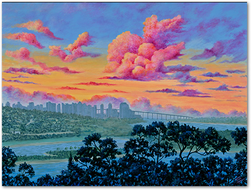 "Brilliance of a New Dawn" by Joan Hansen is a luminous painting that captures the majesty of sunrise over San Diego. Vibrant clouds burst forth in pinks, oranges, and purples above the silhouetted skyline and iconic bridge, while the foreground trees frame the scene. This work celebrates both the beauty of the city and the the sense of renewal and hope, as a new day begins. This painting was created with acrylic paint on a gallery-wrapped canvas. The scene continues to all four sides. It is available for purchase. Prints of this image may also be purchased in a size that fits your space requirements. Please contact the artist by sending her the Contacts & Links form. |